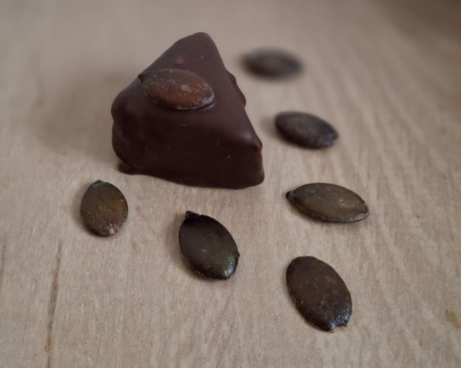 Die Kombination aus Kürbiskern und Marzipan ergibt einen neuen Geschmack, durch Zartbitterkuvertüre abgerundet.