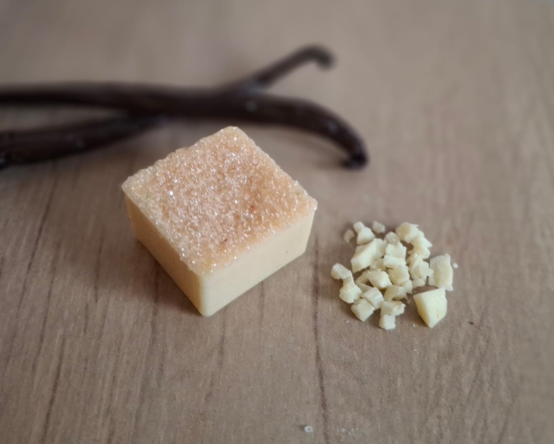 Feiner Vanillenganache aus weißer Kuvertüre mit einer Prise Marillenlikör, eine zauberhafte Harmonie.